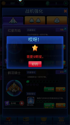 5、这些金币可以用来购买或强化飞机,对于浮游炮和技能也同样适用。当强化达到上限后,需要提升飞机的星级才能进一步强化。如果你对某款飞机感兴趣,可以直接试玩体验。