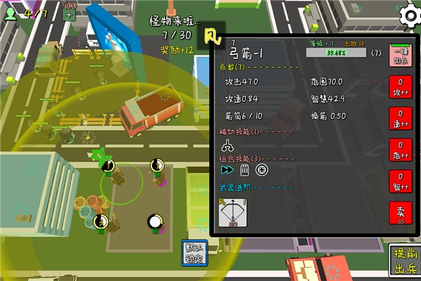 7、防御塔进行升级。防御塔的升级具体分为两个方面:人物升级与武器升级。在人物升级过程中,每提升一级,玩家就能获取属性点,这些属性点可由玩家根据自身需求自由分配。而武器升级则能够带来诸如获得新技能、实现技能升级以及促使武器进化等效果。