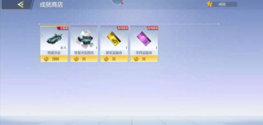 成就商店内有永久彗星冲击、彗星冲击图纸以及运输券的兑换,其中永久的彗星冲击有一次限购,然后两种运输券是每周限购的,运输券的话,菲菲还是建议各位车手每周购买呢,这个是非常划算的哦。成就内的成就币是白嫖中非常重要的道具,20个成就币就可以兑换一个彗星冲击的碎片,一辆彗星冲击需要150个碎片(总计3000成就币)或者直接使用2880成就币直接购买,虽然直接购买会相对便宜一点,但是成就币可不是很好获取的呢。