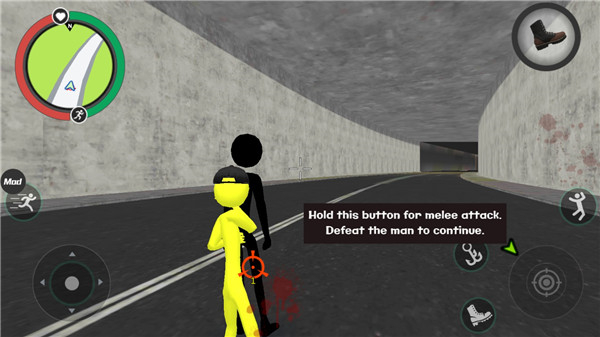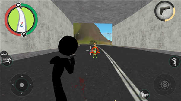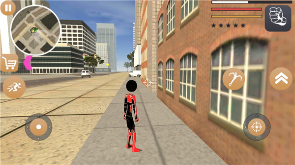 左侧移动、加速,右侧绳索,攻击(跳跃),跳跃,右上侧的武器更换以及血量、经验的显示都实时更新,一览无遗,凭借着大家自由的玩法,与其他帮派的人物进行交火,期间杀人能够获得经验,杀多了会产生星级,警察和其他附近角色会特殊照顾你对你展开火热的进攻,而如何存活,如何将其他人物击杀则是你所需要完成的任务。