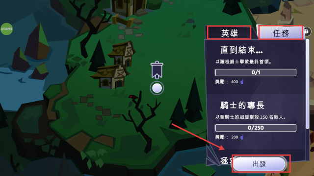 3、在地图界面,我们可以查看【英雄】、【任務】的明细,做好准备后点击【出發】,进入挑战吧。