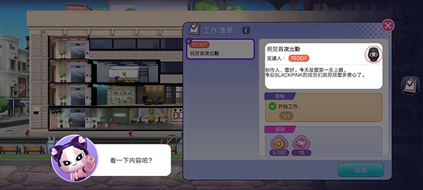 点击“信封”解锁你的首个工作任务,你的好伙伴Teddy已为你发送出勤祝贺;顺利完成工作将收获丰厚奖励,点击“完成”按钮即可领取奖励。