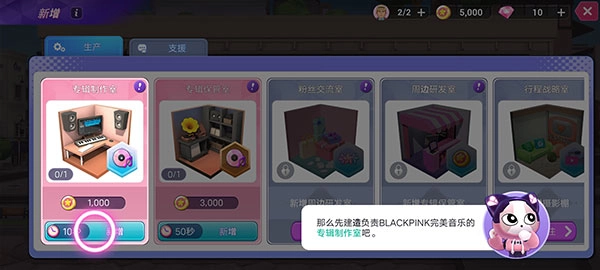 首先来了解建造环节的操作方式:建造部门开展工作时,既需要消耗金币,也得配备参与施工的人员。接下来,点击“新增”按钮,即可完成一个用于打造优质音乐作品的专辑制作室的建造。