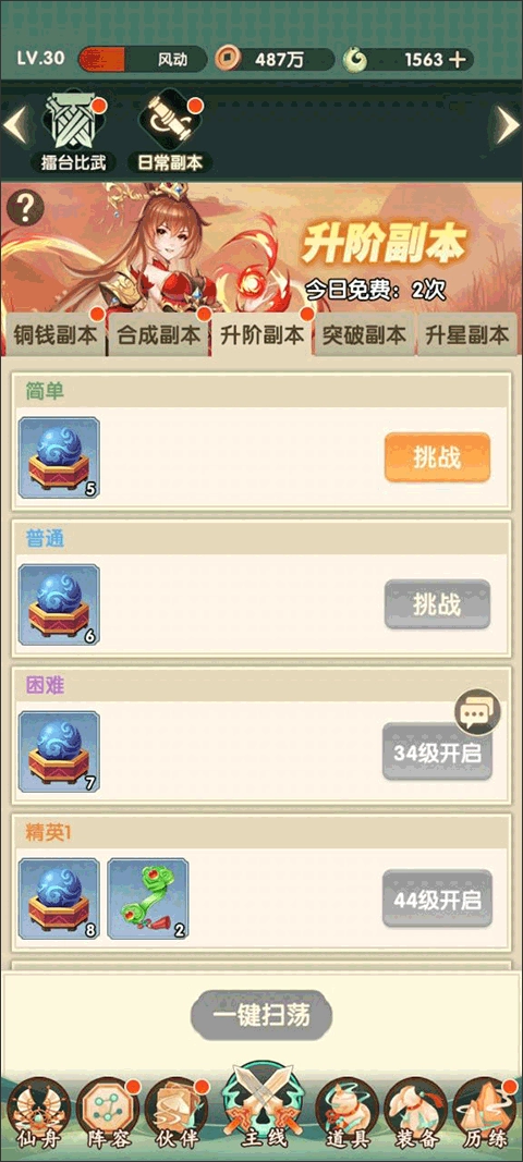 升阶副本,从名字就能知道它的作用是产出升阶丹——这可是伙伴升阶必不可少的道具。要想让伙伴不断成长变强,升阶这一步是无论如何都绕不开的。