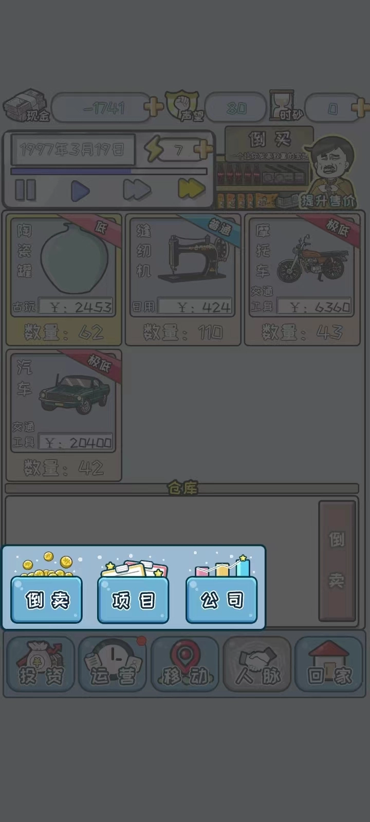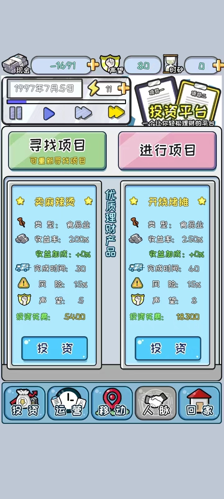 然后按照教程的指引操作,等教程结束后,玩家就能点击【投资】按钮,从中挑选赚钱的途径——总共有倒卖、项目和公司这三种方式。