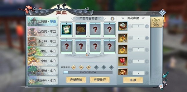 可用于捐献声望的道具有:银币、活跃度、各地图玉块、冰糖葫芦、声望令牌以及榴莲。