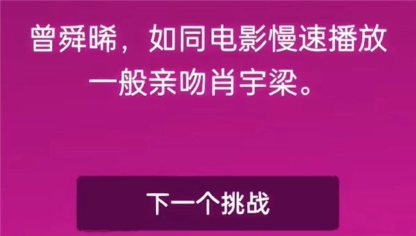 点击停止选择你的问题,比如选择真心话时,可以问“你最喜欢自己身体上的哪个部位”这类问题,很适合成人情侣之间互问互答。3.最后再看大冒险类的问题,比如让曾一吸(玩家可自行取名,此处为示例)像电影慢镜头那样轻吻萧宇梁,难度其实不算高,就是实际做起来有点挑战,但能增进情侣间的感情,非情侣建议不要尝试!