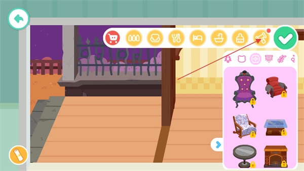 在右侧列表里能借助家具来装扮旅馆,点击小锤子就能进入创作模式。