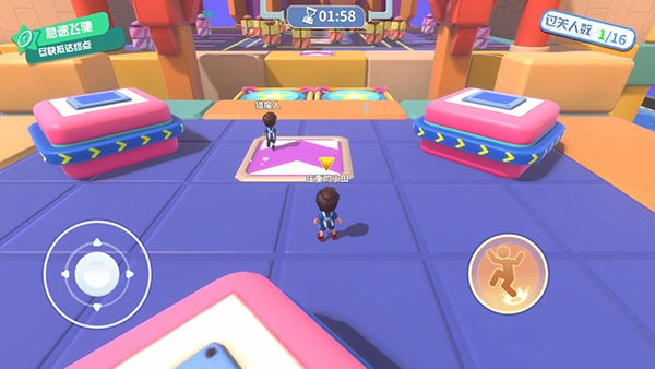 进入地图闯关模式后,玩家可借助左侧轮盘操控角色移动,右侧按钮则用于控制角色跳跃;游戏中每轮设有三个小关卡,唯有坚持到最后的玩家方能赢得胜利。