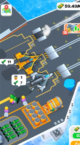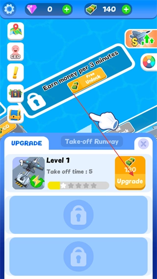 点击飞机航道上起飞器旁的钻石标识,再点击按钮消耗金钱来升级飞机的起飞时间。