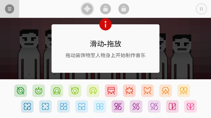 拖拽音效装饰物到方块人角色身上,角色会即刻演奏对应的音效。玩家可以通过实时试听,调整装饰物的位置或者更换角色,直到组合出满意的旋律。