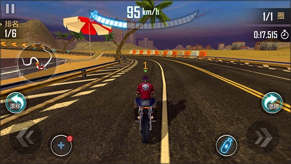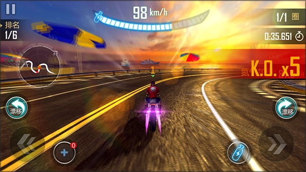 玩家角色头顶的数字代表当前排名,游戏设有左漂移和右漂移操作;左下角是用于干扰对手的火箭弹道具,右下角则是加速瓶,游戏内拾取的道具在本局中均可使用,是不是已经让大家跃跃欲试了呢~