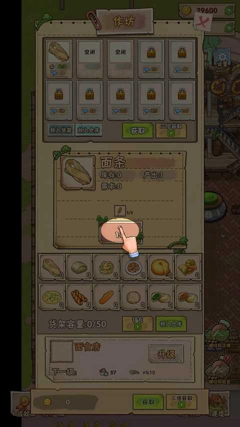 等农作物成熟后,点击并滑动屏幕就能完成收割,收割的成果会存进仓库里。但仓库有容量上限,给仓库升级可以提升容量。