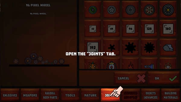 接头或连接器能够用来搭建复杂的车辆、建筑物或者机械装置。你可以在轮子、轮船或者坦克上安装研磨机……游戏里配备了各式各样的关节,像绳索、活塞、螺栓、马达之类的……