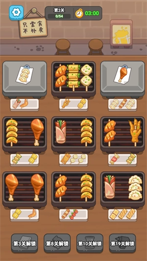 玩家只需把三个一样的串串放到同一个烤肉盘里,就能完成消除啦。