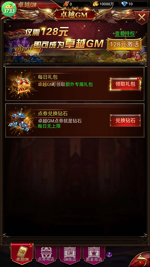 创建角色即可领取满级VIP10、1亿金币、卓越GM特权以及SSR级幻化,助力战力飙升百万。
