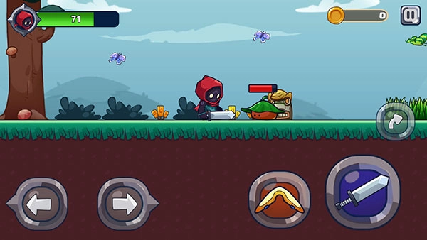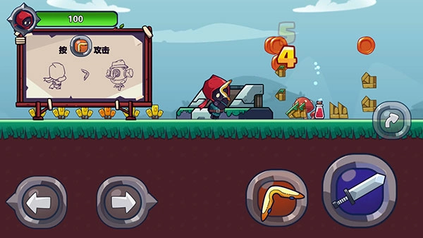 剑的左侧是飞镖,它能在水平方向上来回飞行,远程攻击的威力比剑更强。击败敌人后,会出现可供拾取的金币。