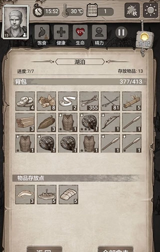 打完废墟后回家迁营,接着按顺序去打石堆(石块、石片、生肉的循环资源点)和灌木丛(浆果、草药、亚麻的循环资源点)。另外,下矿洞记得带上四把镐子。