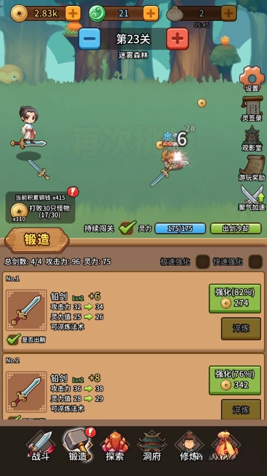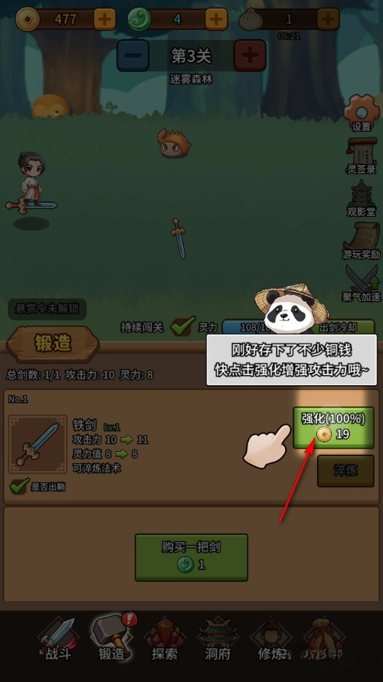 使用铜钱对剑进行升级,打怪伤害更高
