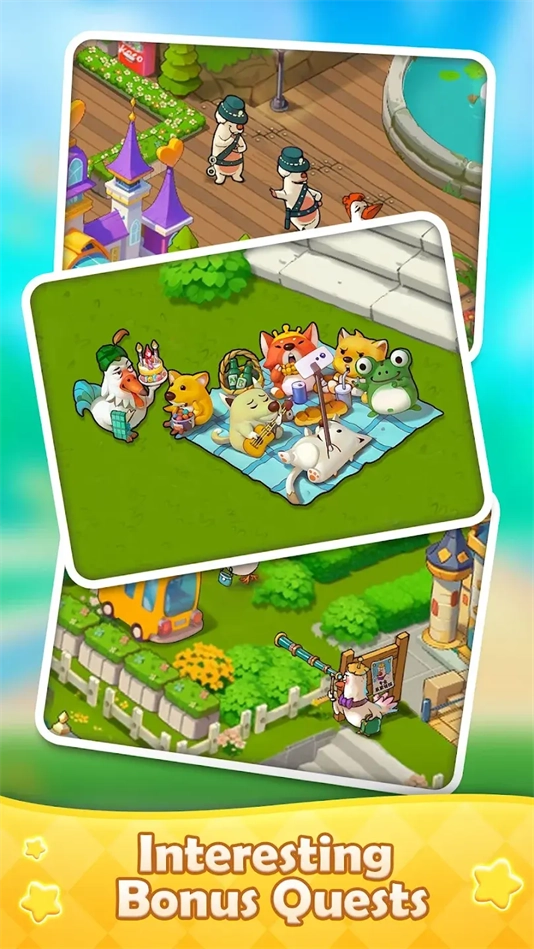 这款游戏巧妙融合了三消、合并与经营三种玩法,玩家需借助三消关卡来获取所需的各类资源。