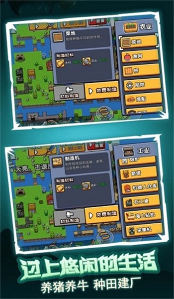 高自由度生存玩法:玩家可自由决定生存路径,既可以投身农业种植与畜牧养殖来稳固物资供给,也能探索幽深的地下洞穴,通过猎杀怪物来获取珍稀资源。