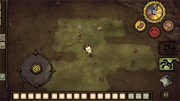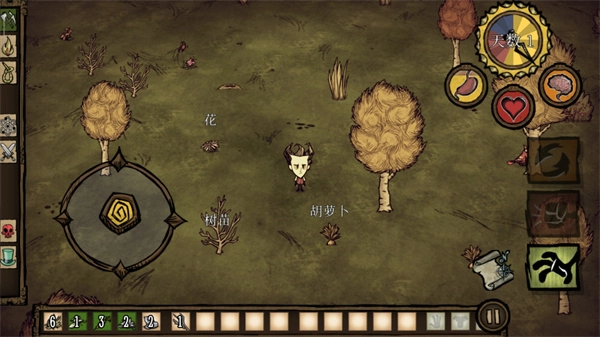 游戏正式开始后,左侧负责操控角色方向,右侧则用于收集物品,玩家得收集所有可利用的资源来抵御饥荒的威胁。