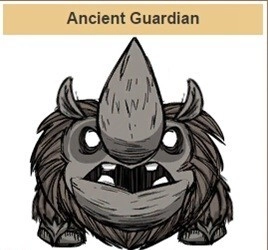 出现地点:地下二层的四根远古柱子处 远古犀牛是遗迹迷宫区的头目级怪物,其外观与行为和发条犀牛颇为相似,但整体更接近覆盖毛皮的真实生物。它拥有2500点生命值,每次攻击可造成100点伤害。和发条犀牛一样,远古犀牛会对目标发起冲锋,同时在近距离时具备近战攻击能力,且攻击频率显著更高。
