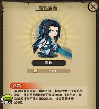 首先我们先瞧瞧这款时装的效果——作为限量款,它的外观确实尽显高端奢华,透着满满的尊贵感!598的定价更是打破了时装价格的原有纪录。再看属性加成,20点速度提升相当实用。最关键的是它的特殊效果:技能必定触发,同时对目标相邻的弟子造成60%的技能伤害;每次触发技能还能永久增加5%攻击力,该效果最多可叠加4层。技能直接变成必发了?这是什么操作!而且不止技能必发,还附带了溅射伤害!这样的属性配置,也确实配得上它这个价位了!