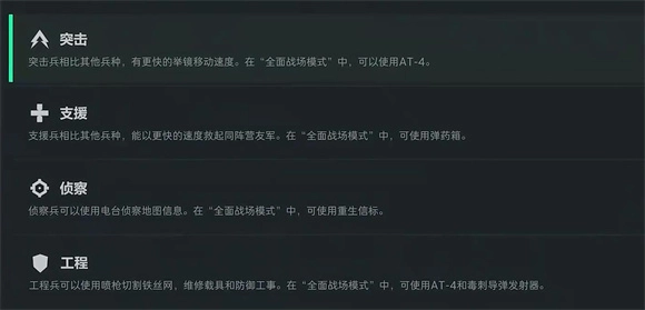全面战场的所有模式都划分成了四个兵种,即突击、支援、工程和侦察。突击干员具备更强的机动性,适合突入目标点为队友突破战线、打开进攻缺口;支援干员能够更迅速地扶起倒地的队友,还可以布置弹药箱与医疗箱,为队友补充物资;工程干员可利用喷枪修理己方载具,也能使用毒刺或火箭筒摧毁敌方载具;侦察干员则能借助重生信标,在地图的任意位置为队友设置一个部署点。