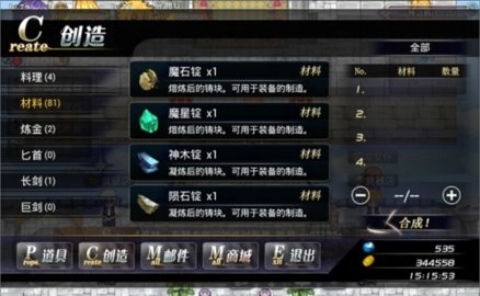 制造装备或料理的操作都在这个界面进行,不过制造时得确保材料准备齐全,而且还得先学会对应的制造技能才行。