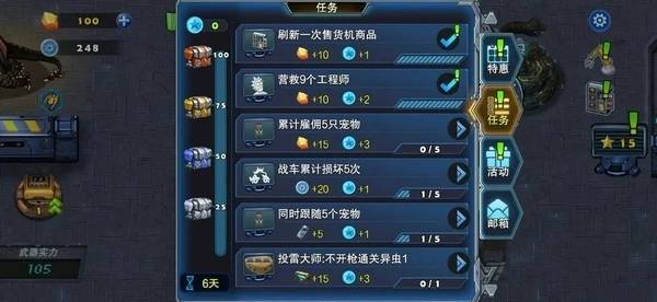 通过完成刷新售货机、累计雇佣宠物、三星通关关卡、每日参与营救工程师等任务(每成功救出100人,全服玩家将获赠10颗氪石,该奖励每日最多发放10次),我攒齐了足够用来升级战车的资源。