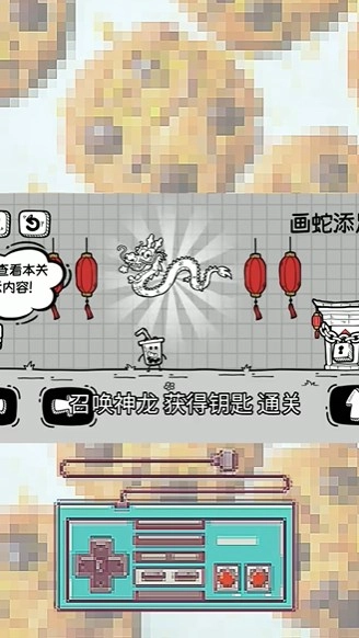 第五关的谜题是“画蛇添足”,需要先在画纸上滑动几笔勾勒出蛇的轮廓,接着从灯笼上取下“脚”的部件安到蛇的身上,再在画上多添几笔,这样就能召唤出神龙,获取钥匙后即可通关。