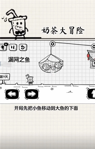 第九关“漏网之鱼”的通关方法是:把网里的那条小鱼向下拖动一点,让它顶一下网子,小鱼就会掉下来,这样就能获得钥匙并通关了。