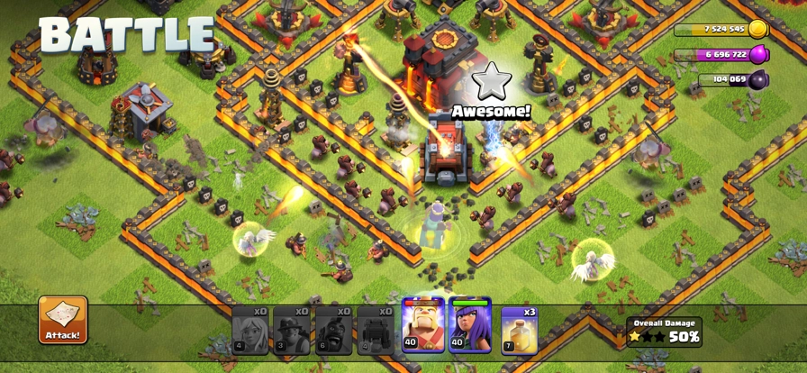 另外,这套暴力狗球流搭配了天女打法,要是弓箭女皇等级不够、处于休息状态或是正在升级,也可以把弓箭女皇、天使和炸弹人替换成气球以及少量亡灵。