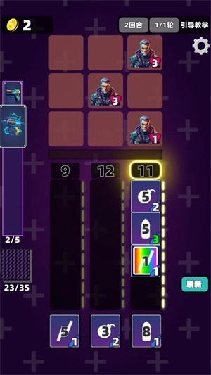 进入战斗状态后,玩家需把数字卡片放置到对应的卡槽中,一旦卡牌数字相加的总和与卡槽的数字一致,就能对当前列的敌人发起攻击。