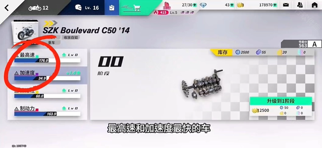 这里比拼的是直线加速,所以要着重看摩托车的【最高速】和【加速度】性能,得升到5级以上才有可能顺利通关。