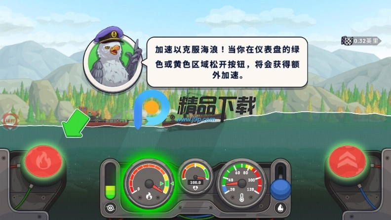 加速冲过海浪!当你在仪表盘的绿色或黄色区域松开按钮时,就能获得额外的加速效果。