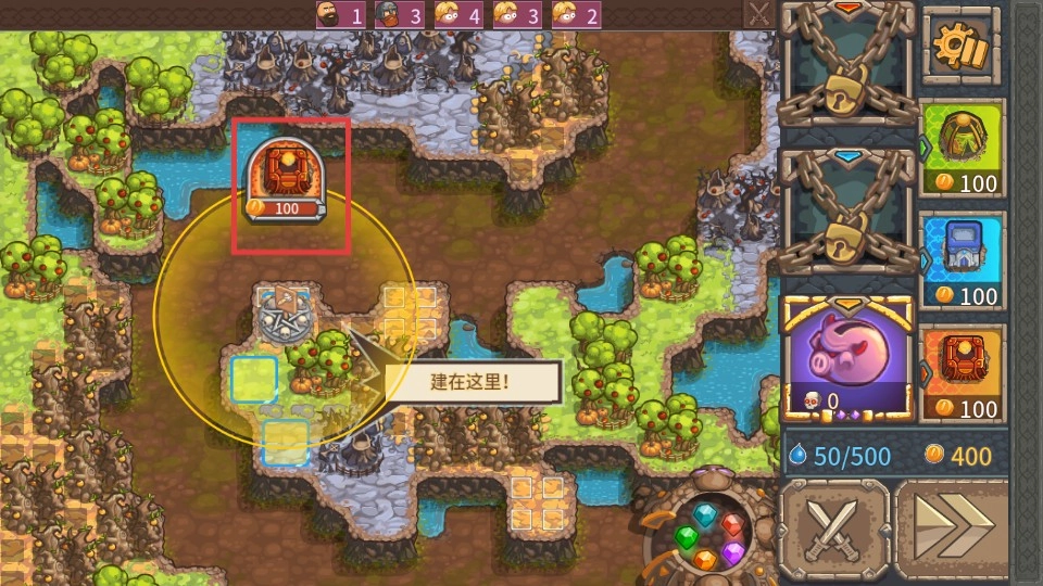 挑选需要消耗100金币的建筑,依据提示把它建造在规定的地方,搭建起防御类建筑。