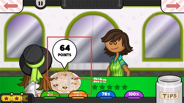 把准备好的餐食送到顾客【Rita】手中,就能得到【64-POINTS】,另外要关注下方的评分进度,以此来提高服务品质。
