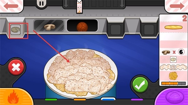 选取已框选的配料,按照之前的摆放规范添加至意面内,操作完成后点击【对勾】按钮确认配料添加完毕。