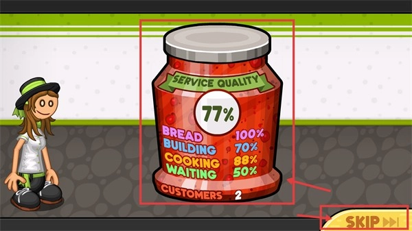 查看【SERVICE-QUALITY】统计罐,这里会显示各环节的评分情况,点击【SKIP】按钮能够快速跳过统计环节,以便继续接待下一位顾客。