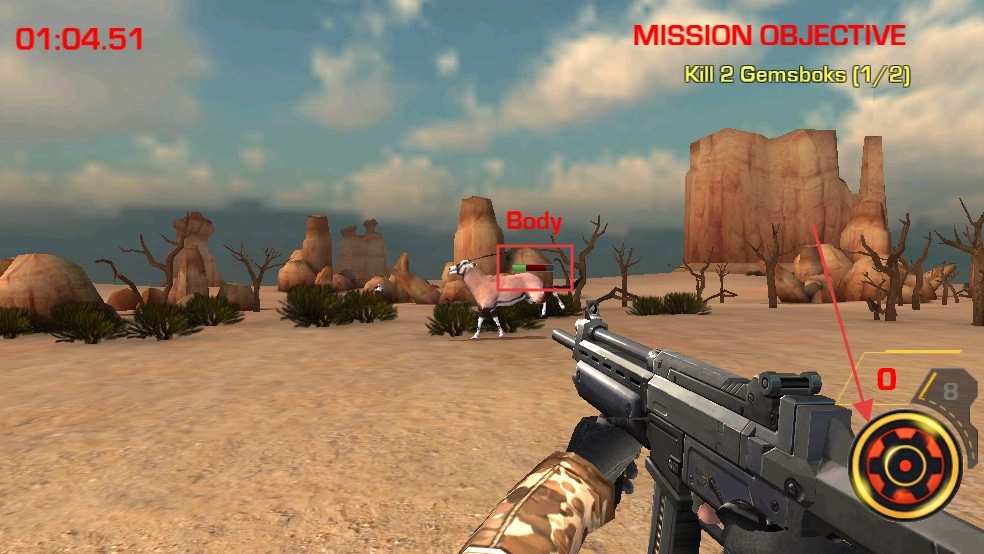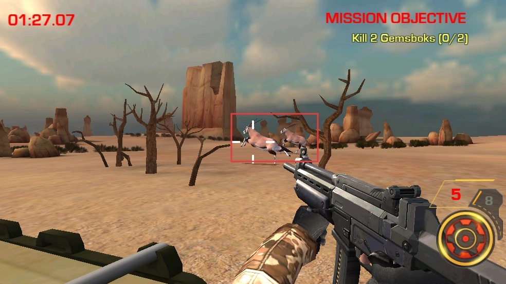 进入场景后,操控枪械瞄准远处的长角羚羊,借助准星锁定目标,扣动扳机进行射击,逐步达成击杀数量要求。