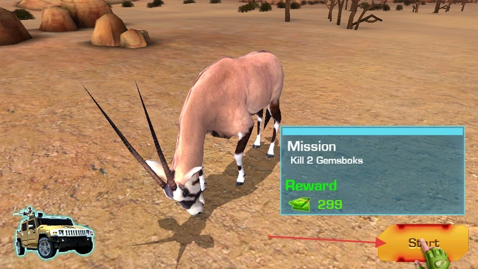 在任务准备界面,这一关的目标是消灭2只长角羚羊,点击右下角的“Start”按钮,即可进入狩猎场景。