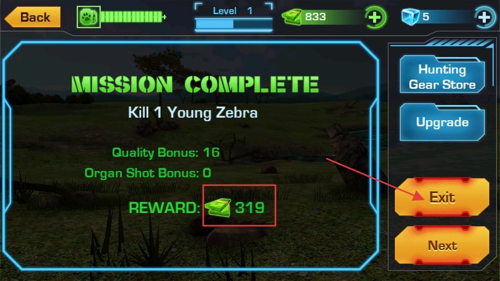 任务结束后,界面会呈现所获得的奖励,点击“Exit”按钮,就能退出当前的任务场景,进入新的关卡。