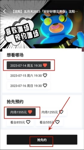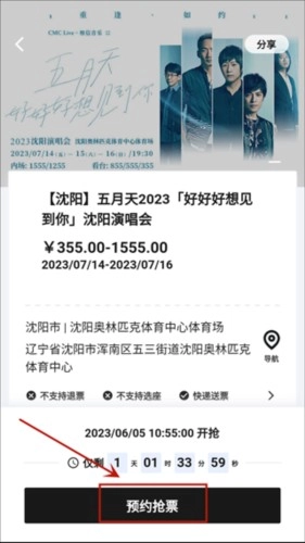 然后点击你想参与的音乐会进行预订。预订成功后,您会收到关于门票销售的通知。一定要在购票高峰期开始前两分钟设置闹钟,接着进入购票高峰期页面并持续刷新。