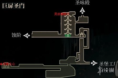 从深坞继续往区域右上角行进,路上会碰到需消耗念珠解锁的钟道与长椅,建议将它们解锁,当作存档点和快速通道。