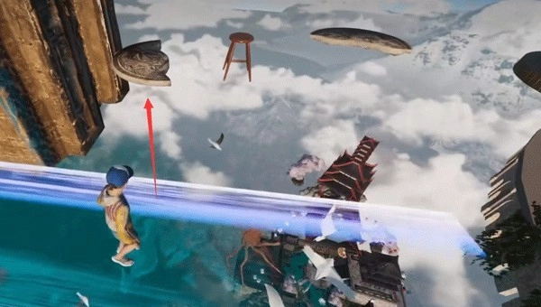 找到金条后,往右边看能发现一个蹦床,接着跳上去借助它弹到对面的塔尖位置。