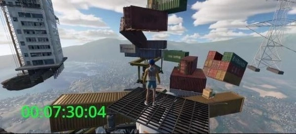 驾驶飞行器径直飞到集装箱区域,接着朝着右前方继续飞行,最后从那台巨大的发电机上跳落下来。