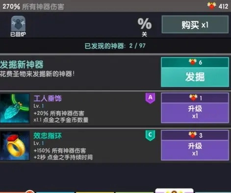 继续前行吧,直到迎来你的首次蜕变。蜕变发生时,你的英雄等级和关卡等级都会重置回1级,但不必担忧——作为补偿,你会得到一些圣物。你可以通过右下角的标签页,用圣物购买或升级强力神器;每次购买后,都会随机获得一件神器,它们能为你提供各类永久加成。所以,当你在推进关卡时感觉吃力,不妨尝试蜕变。相信当你带着一堆酷炫的神器再次来到这里时,这些泰坦就再也不是你的对手了!