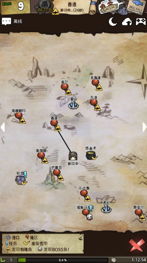 地图旁边的Auto功能,需要你在天赋系统中升级自动导航技能才能解锁,这也是后期解锁放置获取珍珠天赋的必要前提;而左下角的Auto按钮,则是在自动钓鱼技能升满之后才会解锁的。